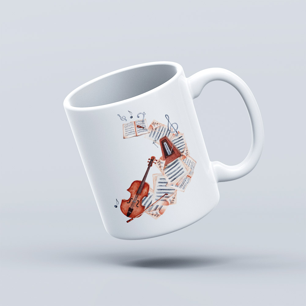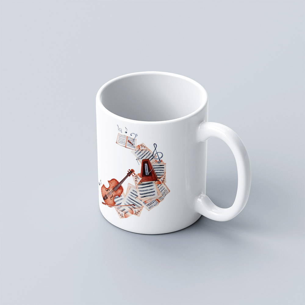 This mug features a classic white glaze with a straight-body design and a comfortable rounded handle. The front is adorned with a charming musical instruments-themed illustration — colorful and vibrant — adding a touch of melody and creativity to your daily routine.